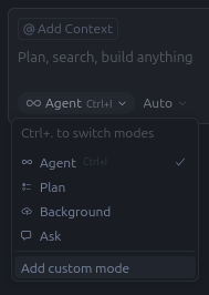 Once enabled, you’ll need to start a new chat and then open the Mode Switcher, which defaults to Agent mode. At the bottom of the dropdown will be an option to add a new custom mode: